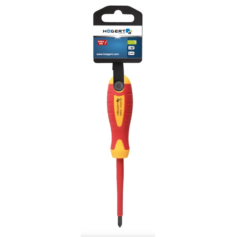 Tournevis isolé Pozidriv Högert HT1S944 PZ2 x 100 mm, spécialement conçu pour les travaux électriques professionnels sur installations jusqu’à 1000 V AC.
