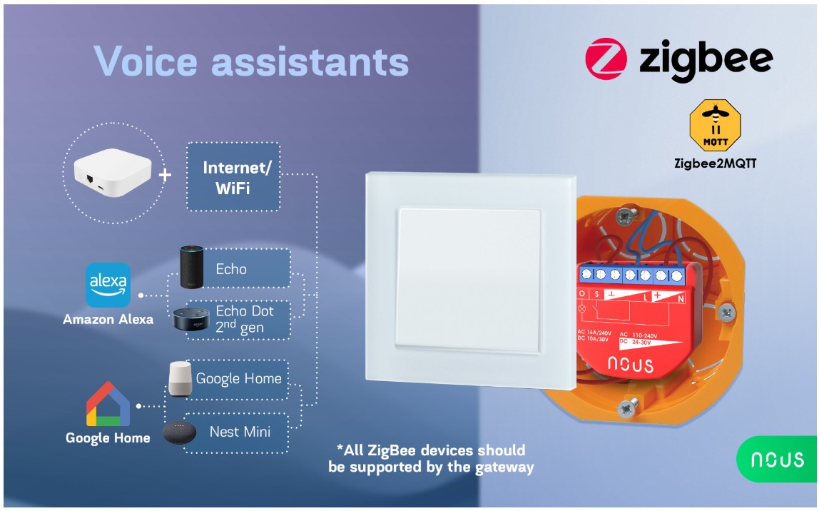 L'interrupteur Zigbee NOUS В2Z est conçu pour organiser l'arrêt automatique et manuel des appareils électriques de la pièce, via un accès à distance via Internet, à l'aide d'un smartphone ou d'une tablette avec l'application Nous Smart Home installée.