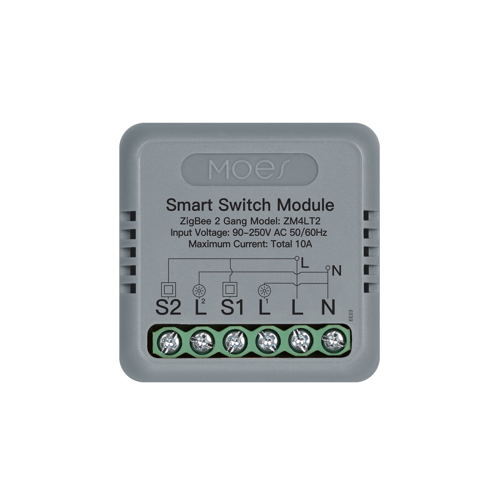 Le MOES ZM-104B-M-LT est un micromodule domotique Zigbee 3.0 à double relais conçu pour automatiser l’allumage ou l’extinction de deux circuits électriques individuels, tels que l'éclairage ou les prises.