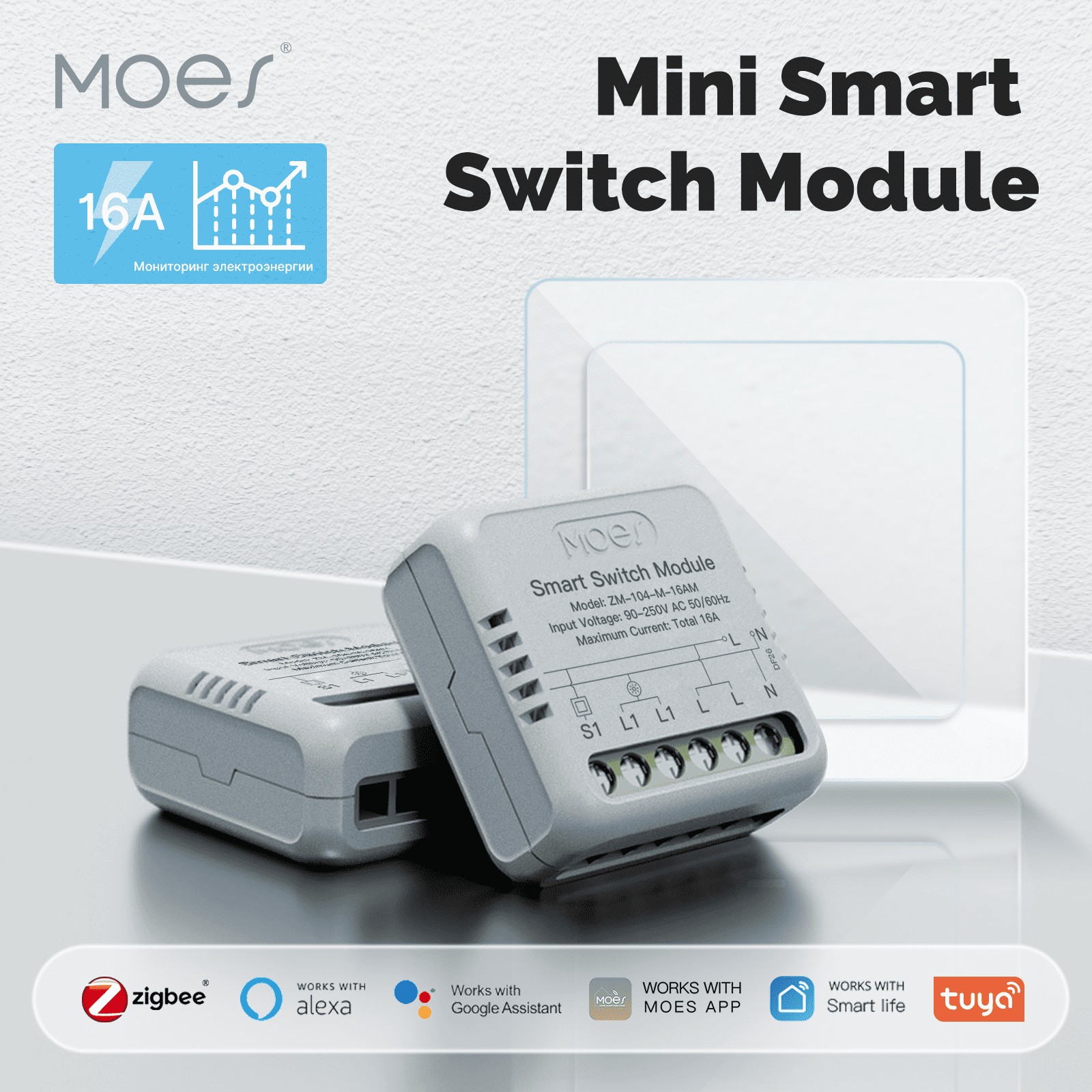 Le MOES ZM-104-M-16AM est un micromodule ON/OFF Zigbee 16A pour pilotage intelligent et mesure de consommation électrique, à intégrer derrière un interrupteur ou prise classique.