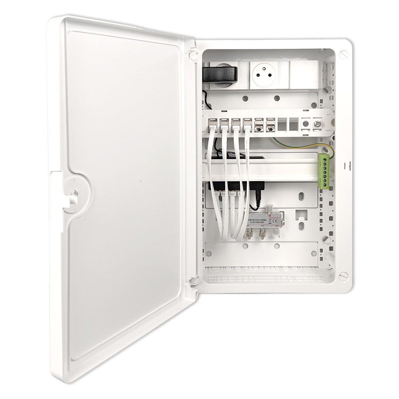 Un coffret de communication Grade 3 TV permet de centraliser et distribuer Internet, téléphonie et télévision (TNT/SAT) sur RJ45 dans toute l'habitation, avec des débits jusqu'à 10 Gbit/s, parfaitement adaptés à la fibre et aux équipements multimédias récents.