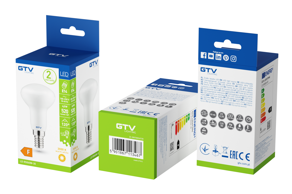 Le GTV LD-R5060W-30 est une ampoule LED R50 avec culot E14, d’une puissance de 6 W, délivrant une lumière blanc chaud à 3000 K et un flux lumineux de 470 lumens.
