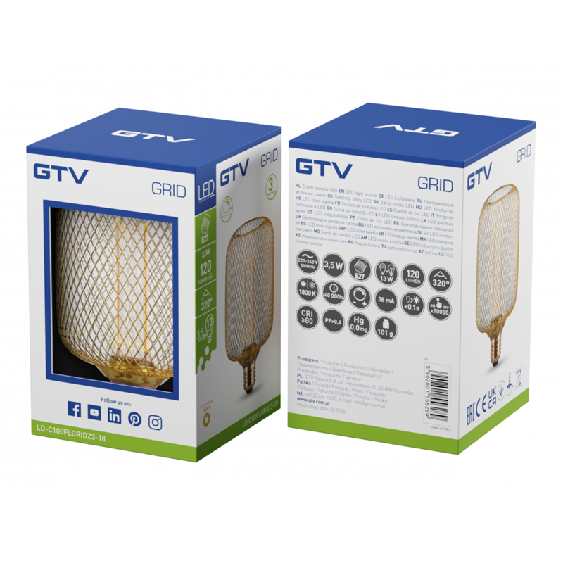 La LD-C100FLGRIDZ3-18 est une ampoule LED décorative de forme C100 avec culot E27, d’une puissance de 3,5W, produisant une lumière très chaude à 1800K, avec une luminosité de 120 lumens et un angle d’éclairage large de 320°.