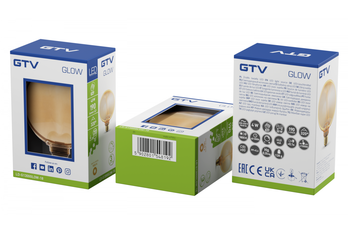 La LD-G1300GLOW-18 est une ampoule LED décorative GLOW de forme G130, avec un culot E27, consommant 4W, offrant une luminosité de 190 lumens et une température de couleur très chaude de 1800K, avec un angle d’éclairage de 320°.