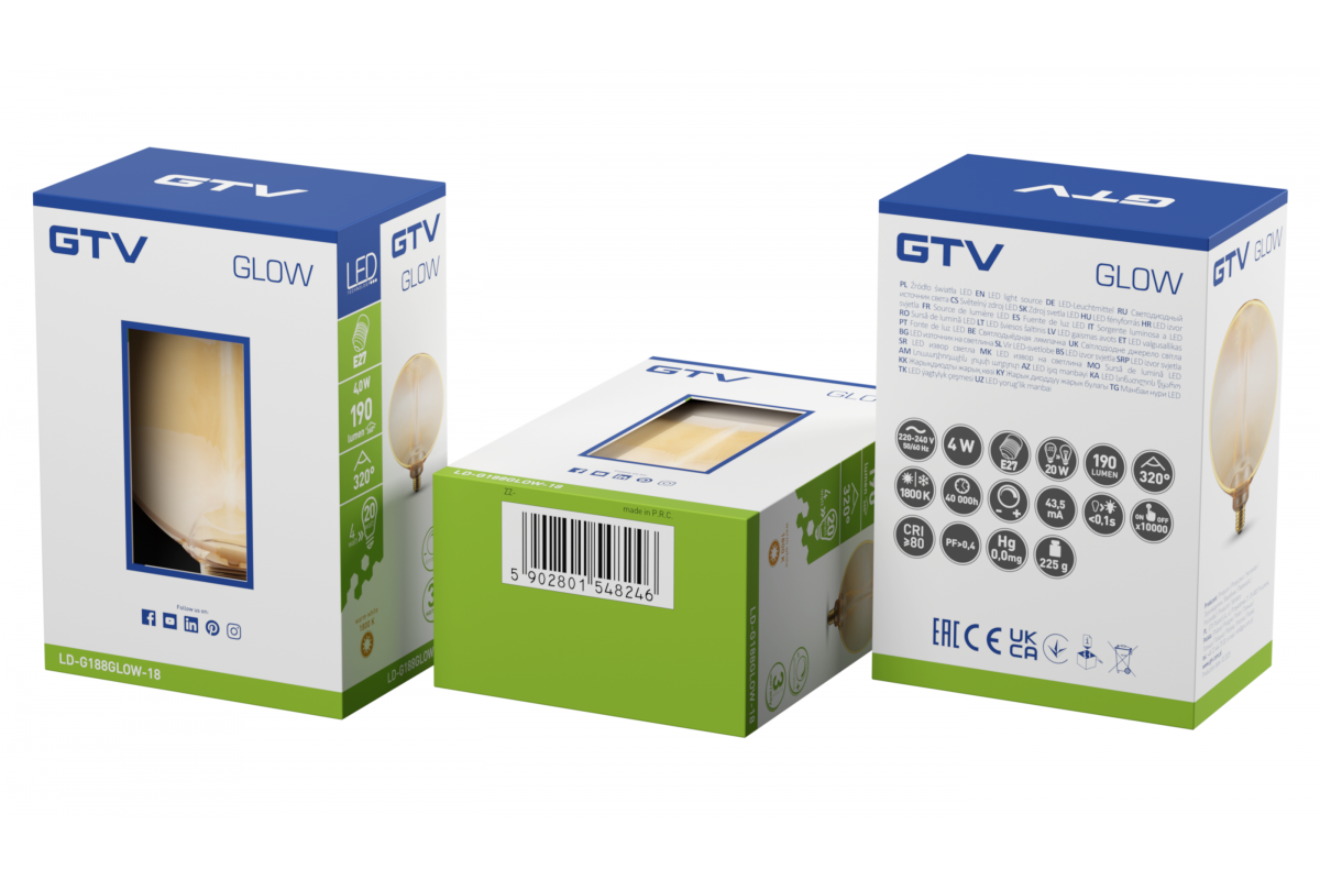 La LD-G188GLOW-18 est une ampoule LED de forme G188, avec un culot E27, d'une puissance de 4W, offrant une luminosité de 190 lumens, en lumière très chaude à 1800K, idéale pour créer une ambiance chaleureuse.