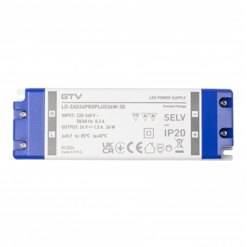 Alimentation / driver LED GTV PRO+ LD-ZAS24PROPLUS36W-30, sortie 24 V DC – 36 W (1,5 A), entrée 220–240 V AC 50/60 Hz, IP20, boîtier plastique 147 × 48 × 24 mm, classe II.