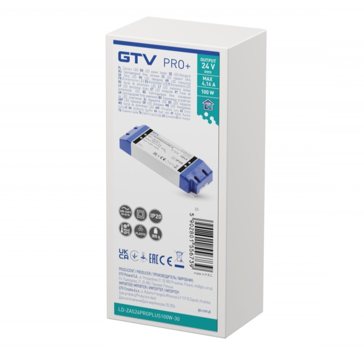 Alimentation / driver LED GTV PRO+ LD-ZAS24PROPLUS100W-30, sortie 24 V DC – 100 W (≈4,16 A), entrée 220–240 V AC 50/60 Hz, IP20, boîtier plastique 180 × 66 × 32 mm, classe II.