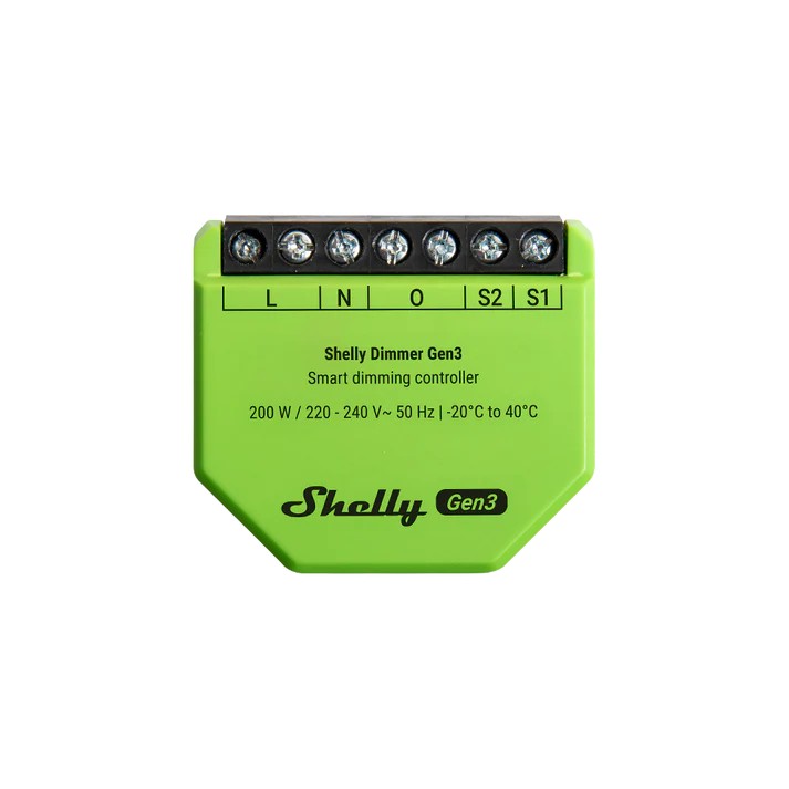 Shelly Dimmer Gen3 est un micromodule variateur intelligent 1 canal pour éclairage, piloté en Wi‑Fi et Bluetooth, capable de faire varier des lampes dimmables jusqu’à 200 W.