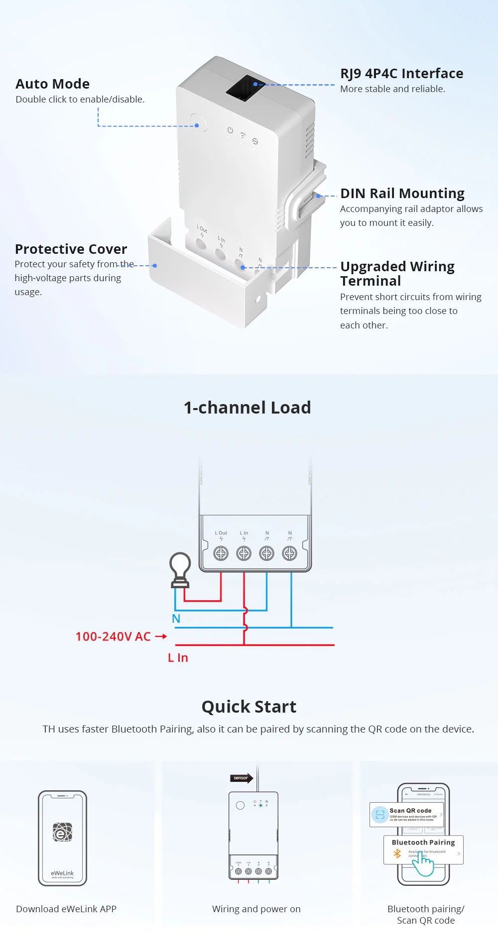 Installation : Câblage en série sur la charge (phase/neutral selon schéma), fixation sur rail DIN, connexion du capteur RJ9 si nécessaire, appairage à eWeLink par Wi‑Fi, puis création de scénarios, seuils, courbes historiques, et éventuelle intégration dans Home Assistant ou assistants vocaux.