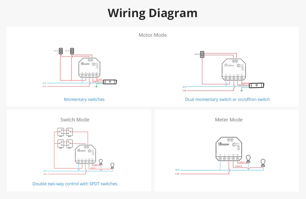 Compatibilité : Compatible avec la plupart des circuits d’éclairage 230 V, petits appareils, moteurs tubulaires 3/4 fils pour volets roulants/stores, interrupteurs externes (bascule, poussoir, SPDT), et écosystème eWeLink avec intégration vocale Alexa/Google