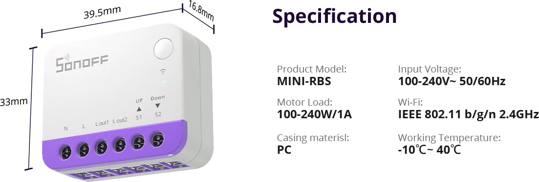 SONOFF MINI‑RBS est un micromodule Wi‑Fi intelligent pour volets roulants, ultra‑compact, conçu pour se loger dans une boîte d’encastrement EU afin de piloter précisément l’ouverture et la fermeture de moteurs 230 V jusqu’à 1 A.