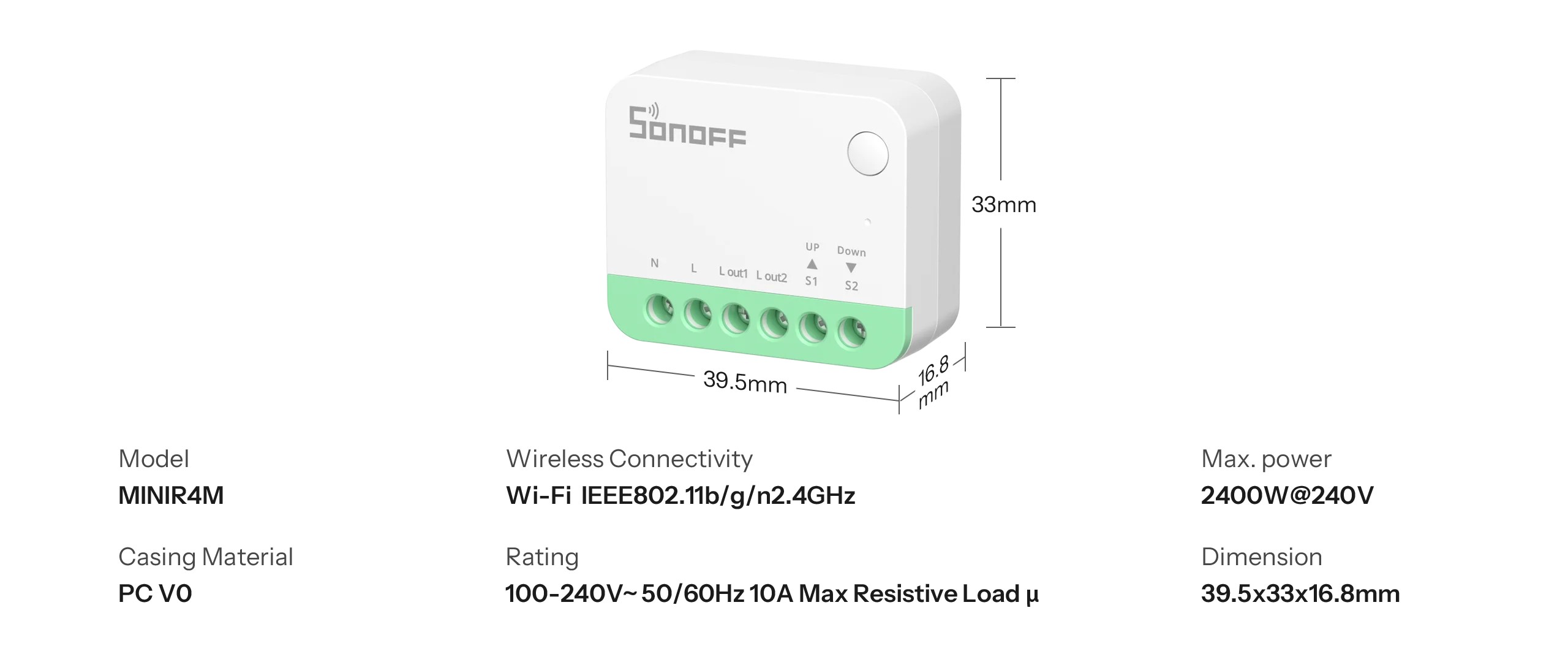 SONOFF MINIR4M est un micromodule interrupteur Wi‑Fi ultra‑compact 10 A, compatible Matter, conçu pour transformer un éclairage ou un appareil existant en équipement connecté tout en s’intégrant dans de petites boîtes d’encastrement EU/86/120.