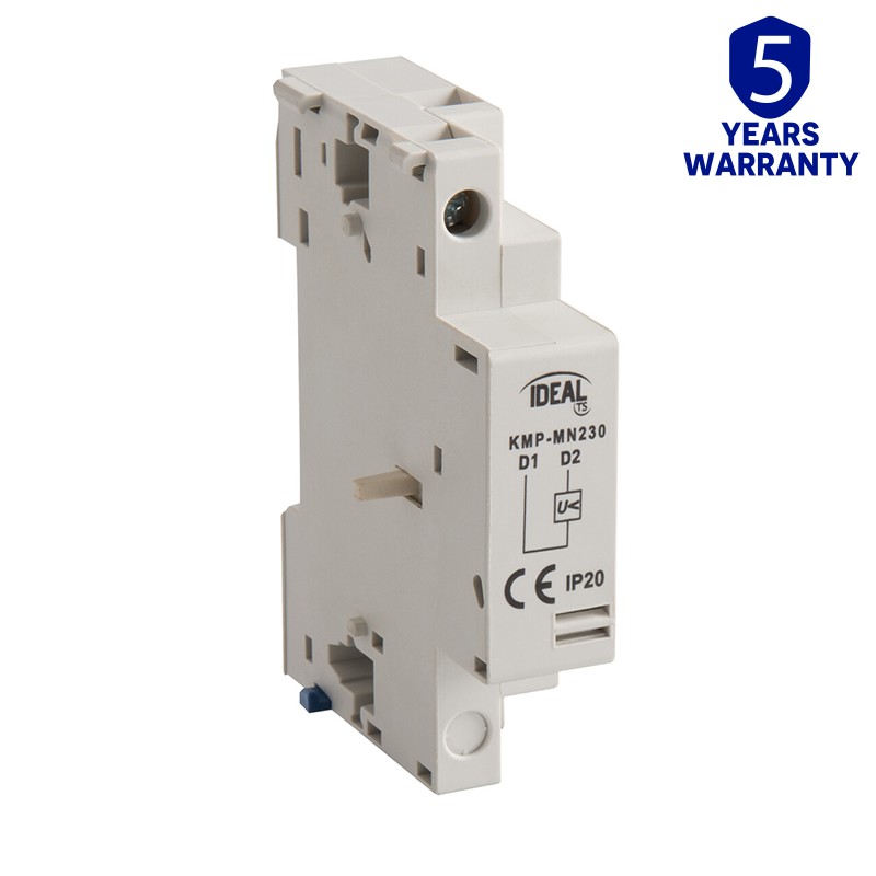 Le Kanlux KMP-MN230 référence 24084 est un déclencheur sous-tension (220-240V AC) conçu pour être installé latéralement sur les disjoncteurs moteurs de la série KMP afin de déclencher automatiquement l'interrupteur en cas de baisse ou de coupure de courant.