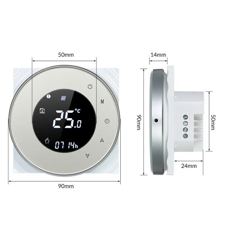 Autres information : Design rond élégant et moderne (86mm diamètre) coordonné avec les intérieurs contemporains, écran LCD tactile rétroéclairé, capteur de température NTC10K (NTC3950, 10K) intégré avec support optionnel de capteur externe, programmation hebdomadaire flexible jusqu'à 6 périodes par jour