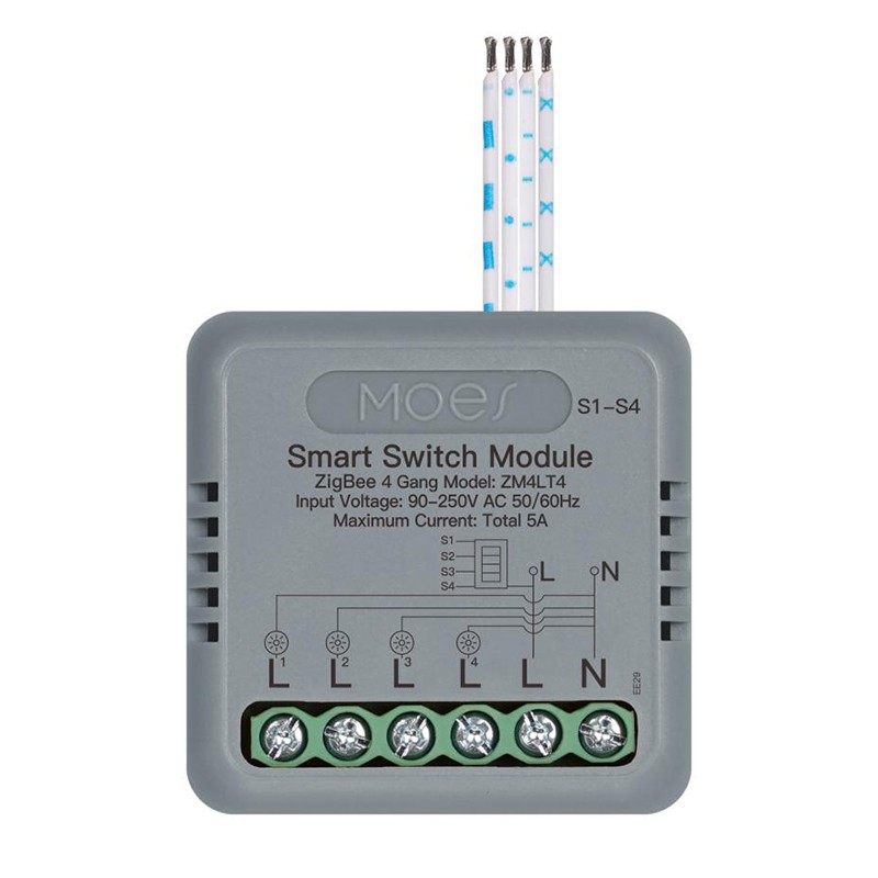 Le MOES ZM-104D-M-LT est un micromodule interrupteur ZigBee 3.0 4 voies (4 gangs) à encastrer, permettant de commander jusqu’à quatre circuits d’éclairage ou prises (5A au total) à distance via l’écosystème Tuya/Smart Life.