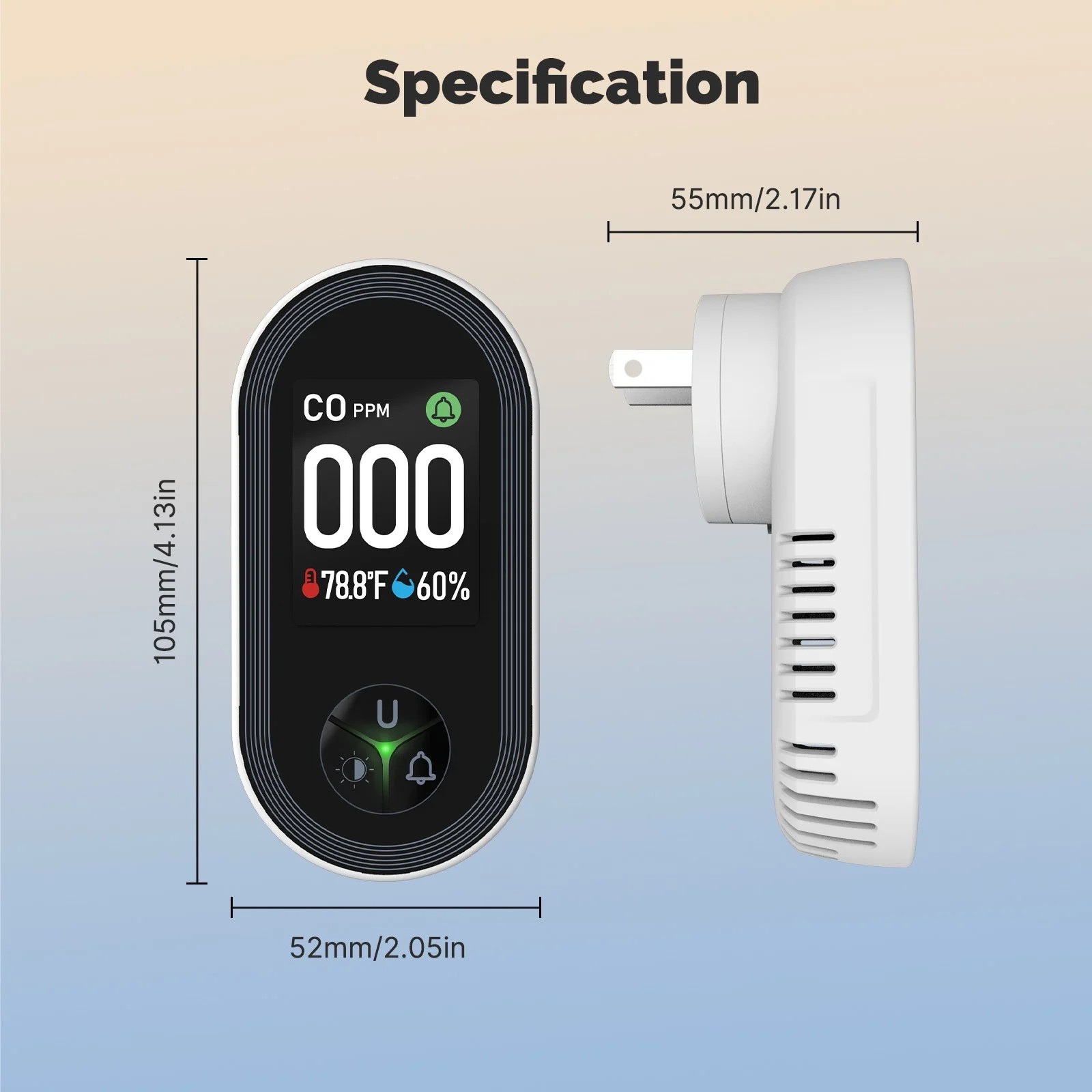 Ce détecteur plug-and-play ne nécessite aucune installation complexe ni câblage, il suffit de le brancher sur une prise murale standard pour bénéficier d'une protection immédiate contre l'intoxication au monoxyde de carbone. Les avantages majeurs incluent l'affichage simultané en temps réel des trois mesures (CO, température, humidité) sur un écran HD facile à lire, un système d'alarme visuelle avec voyants lumineux colorés et sonore puissant, ainsi qu'un boîtier en plastique ABS ignifuge garantissant la sécurité maximale.