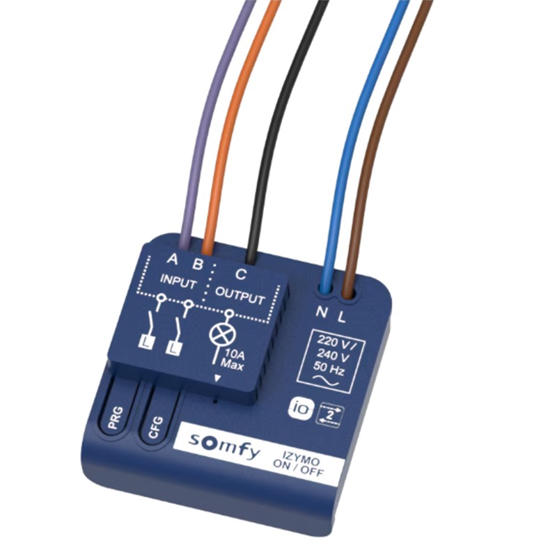 Le récepteur On/Off IZYMO io 1822649 de Somfy est un micromodule encastrable qui permet de piloter à distance un éclairage filaire (jusqu’à 10 A) via la radio io-homecontrol et les solutions connectées Somfy.