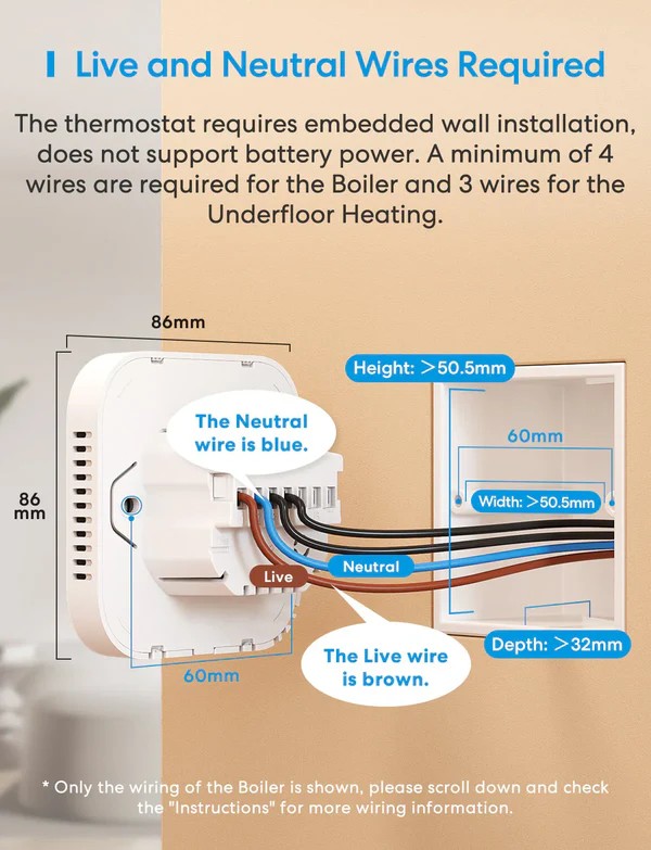Installation : Remplacement d’un ancien thermostat mural, raccordement L et N + contacts chaudière/plancher chauffant, installation DIY possible en moins de 30 minutes pour utilisateur averti
