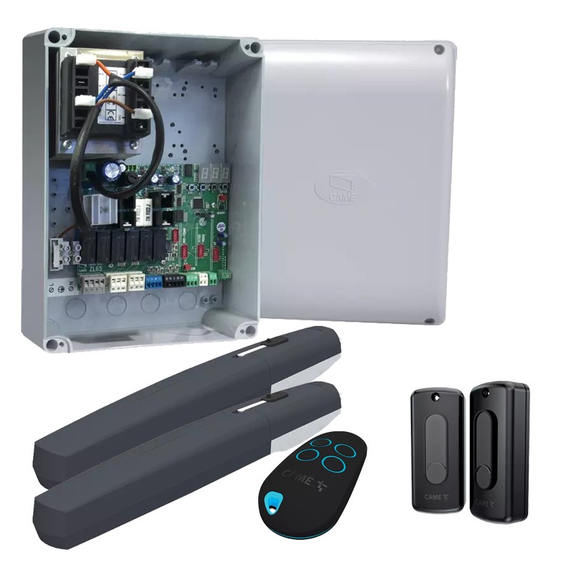 Le CAME 8K01MP-015 est un kit complet de motorisation AXI 24V pour portail battant, livré avec moteurs, centrale de commande, 1 télécommande et 2 cellules de sécurité, idéal pour un usage résidentiel durable.