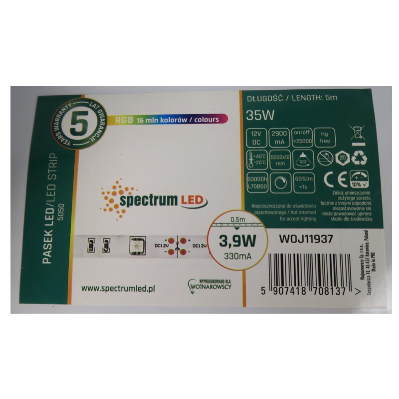 Ruban LED Spectrum WOJ11937, bande RGB 12 V DC, 5 m × 10 mm, puissance totale 35 W (≈7,8 W/m), IP20, 30 LED/m type 5050, angle 120°.