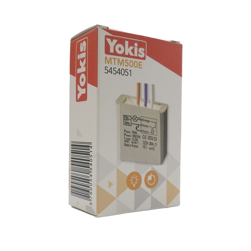 La YOKIS MTM500E est une minuterie encastrable 500W 100 pourcent électronique et étanche, à installer derrière un bouton poussoir pour temporiser un circuit d’éclairage de 2 secondes à 4 heures avec préavis d’extinction.
