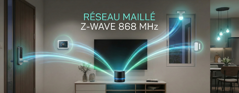 Fréquence sub-GHz : la bande 868 MHz de Z-Wave évite les interférences avec le Wi-Fi 2,4 GHz utilisé par Zigbee, garantissant des communications plus stables dans les environnements domestiques saturés d'appareils sans fil.